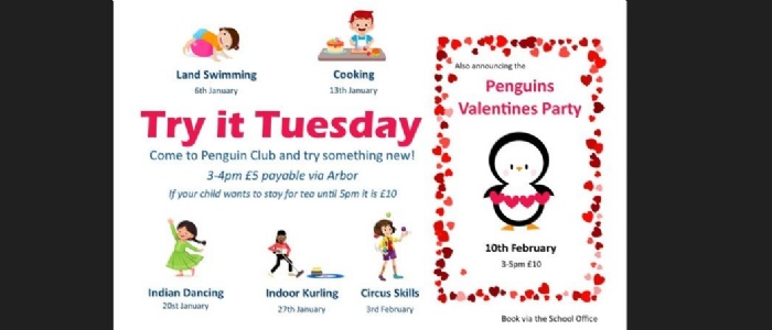 Please see the poster for the Try it Tuesday activities coming up in the New Year!
